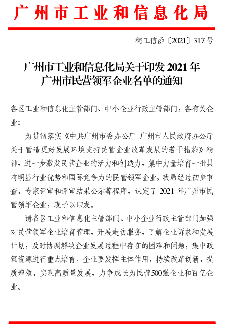 繼2020年7月我司被省級中小企業(yè)主管部門認(rèn)定、成為重點培育的“專精特新”中小企業(yè),2021年7月我司被國家工信部評選認(rèn)定為第三批專精特新“小巨人”企業(yè)后,2021年10月我司榮獲廣州市2021年民營領(lǐng)軍企業(yè)稱號!